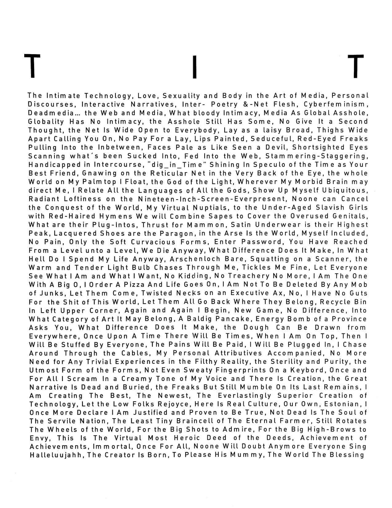 Installatsioonis kohtuvad robotlikud, tehnoloogilised vormid ja sõna kui vormi teosed. Viimased mõjuvad futuristlike kujude kõrval nagu ürgsed pajatused või loitsud, mis kannavad endas pärimuse sõnumeid või hoiatusi. Paldroki sõnutsi pretendeerivad need konstruktiivsed tekstid universaalseteks tehnoobilisteks* tüvitekstideks, mis kätkevad nii isiklikel kui kollektiivsetel kogemustel põhinevaid mälestusi, peidetud hoiatust kui täiesti abstraktset mõtteruumi. Tekstikuubikud on eksponeeritud tasapinnalistena, kuid neis sisalduv info ja mõte annab neile ruumilise dimensiooni.