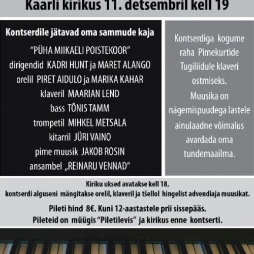 Kaarli kirikus toimub 11. detsembril kell 19 heategevuslik kontsert „Su samme kaja“, millega kogutakse raha Pimekurtide Tugiliidule klaveri ostmiseks. Kontserdil esineb Püha Miikaeli poistekoor, orelil Piret Aidulo ja Marika Kahar, klaveril Maarian Lend, bass Tõnis Tamm, trompetil Mihkel Metsala, kitarril Jüri Vaino, pime muusik Jakob Rosin ja ansambel Reinaru Vennad. Uksed avatakse kell 18, kontserdi […]