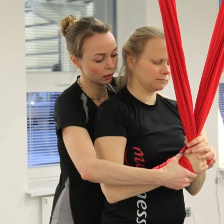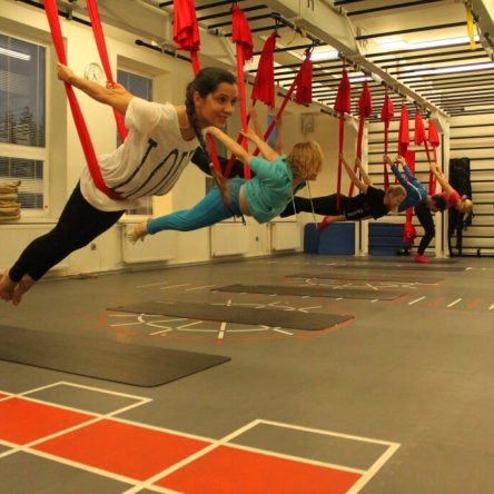 Terase spordikeskuse joogasaalis on Anna Sarapi juhendamise all inimesed, kes on esimest korda tegemas Aerial Yoga`t, sealhulgas ka treeneri sõbrad Põhja-Eesti Pimedate Ühingust,.