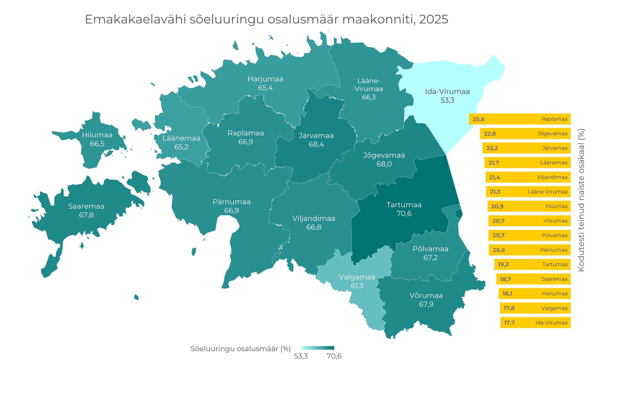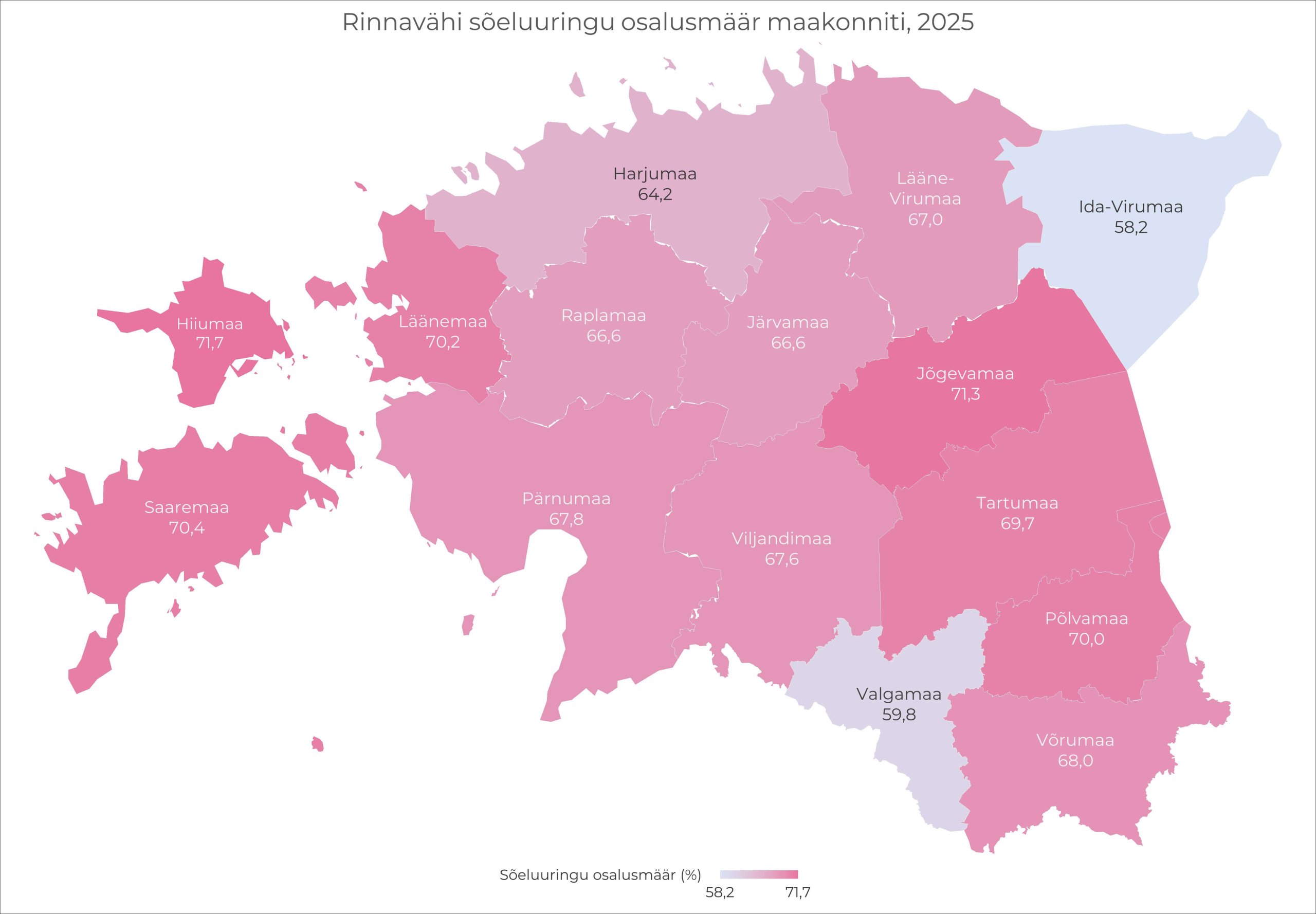 Koos kutsutavate arvuga kasvas 2025. aastal ka üldine osaluse protsent (62,3%, 2024. aastal 61,5%), andes uuringul osalejate arvuks juba üle 60 000 mehe ja naise. Kõige kõrgem osalusmäär oli juba mitmendat aastat Võru maakonnas. Samuti ületas osalusmäär eesmärgilist 70% Jõgeva, Hiiu, Tartu ja Põlva maakondades. Kõige madalam on osalus endiselt Ida-Viru, Harju ja Valga maakondades. Enim osalevad soolevähi sõeluuringus Hiiu maakonna naised (78%) ja Võru maakonna mehed (69%).