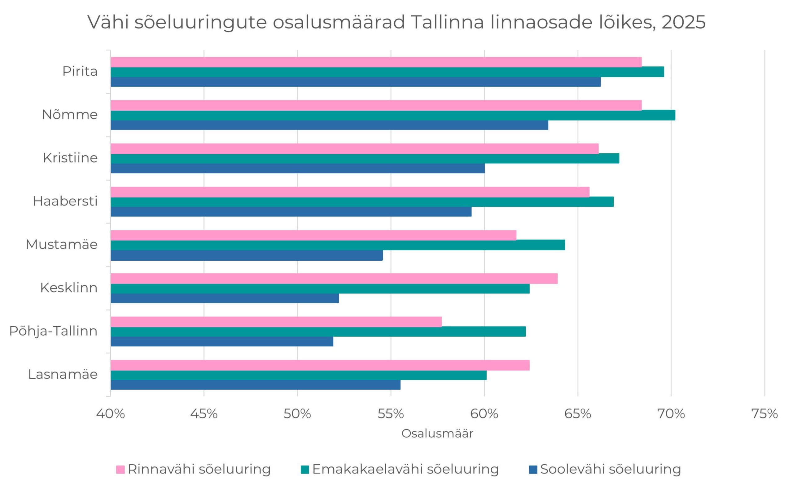 Tallinna linnaosade lõikes on sõeluuringutes osalemine väga erinev. Madalama osalusmääraga paistavad silma Lasnamäe, Kesklinna ja Põhja-Tallinna piirkonnad, samas kui Nõmme ja Pirita eristuvad aktiivsema osalusega. Soolevähi sõeluuringu puhul on aga märgatav meeste tagasihoidlikum osalus Kesklinnas.