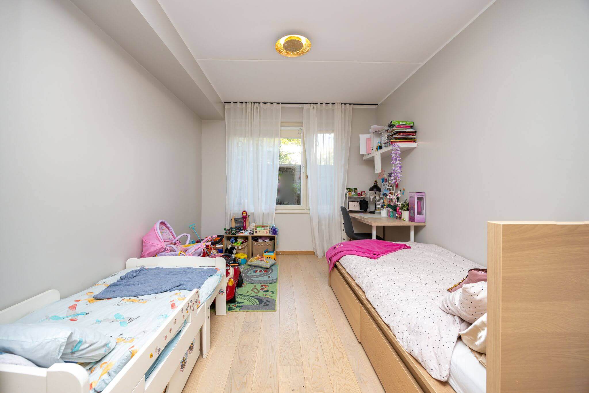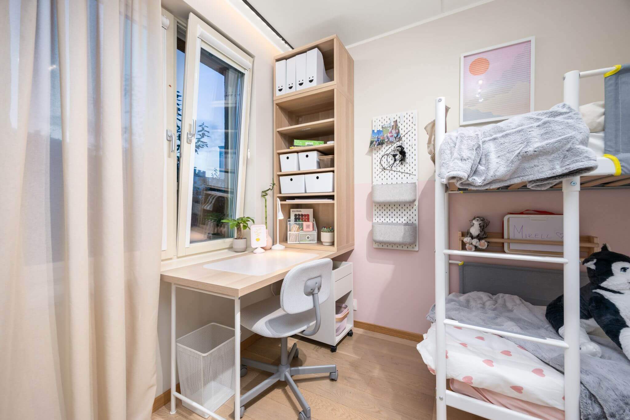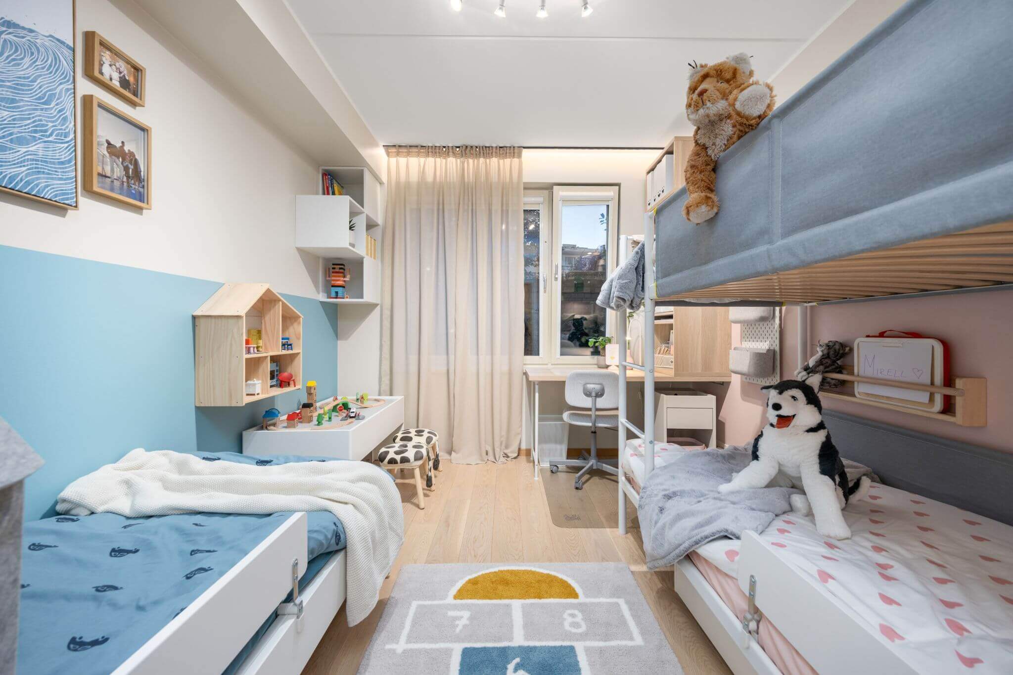 Jagatud toa korral on väga oluline luua iga lapse jaoks isiklik ruum. „Seda konkreetset lastetuba sisustades tahtsin luua vaikse hubase keskkonna, kus igal lapsel on oma koht, kus tegeleda rahumeelsete tegevustega nagu õppimine, magamine, lugemine ja joonistamine,“ ütleb Sälli.