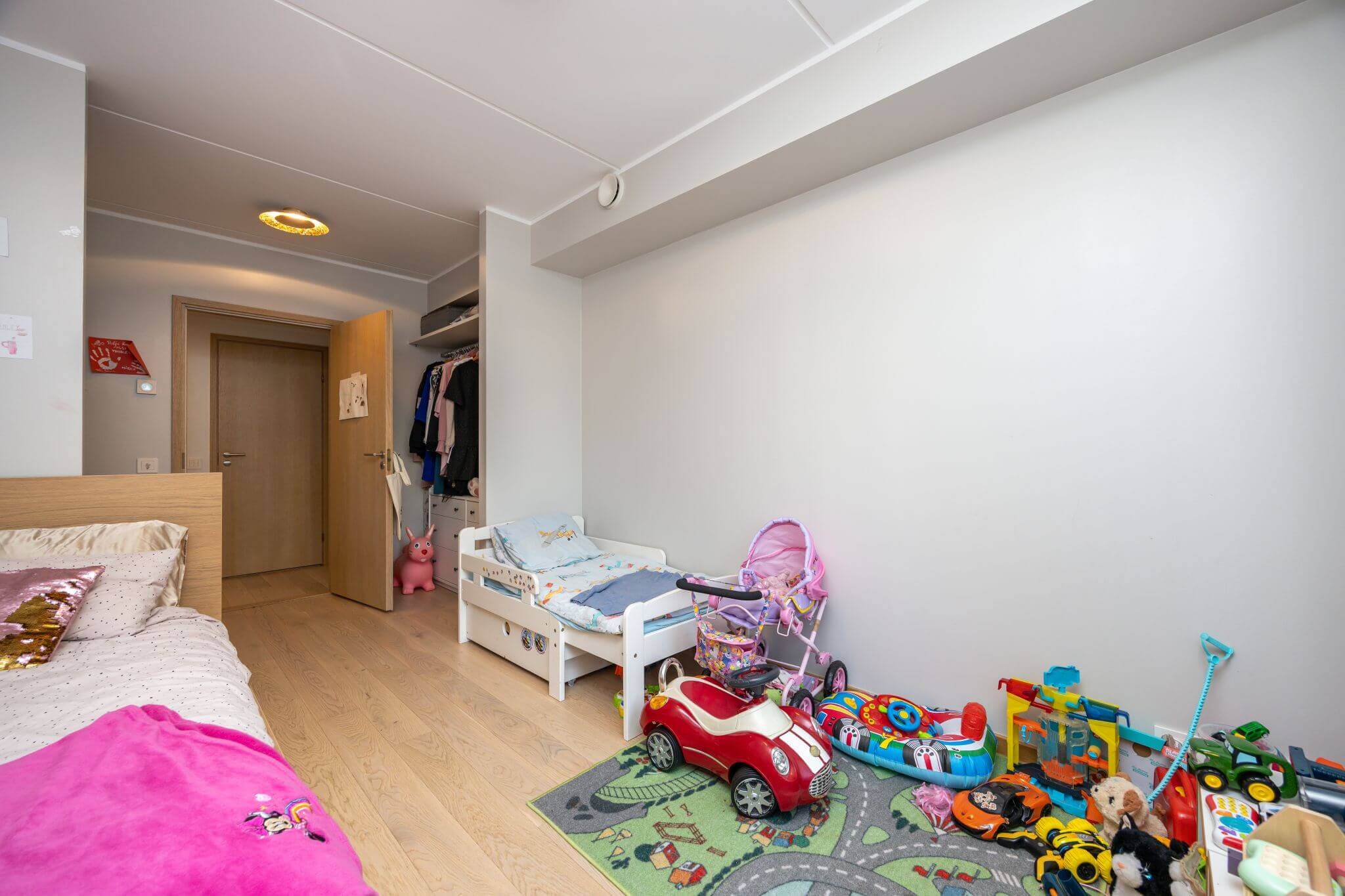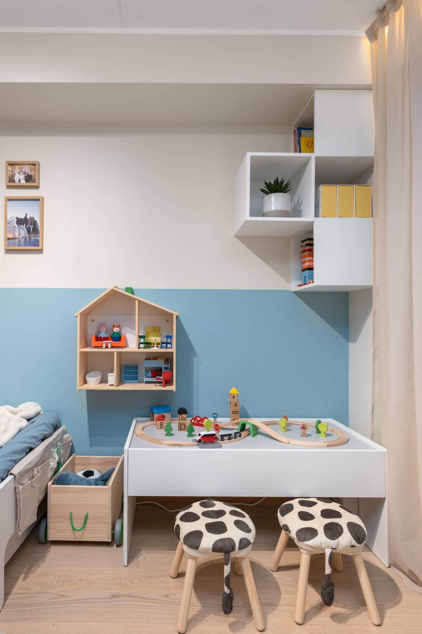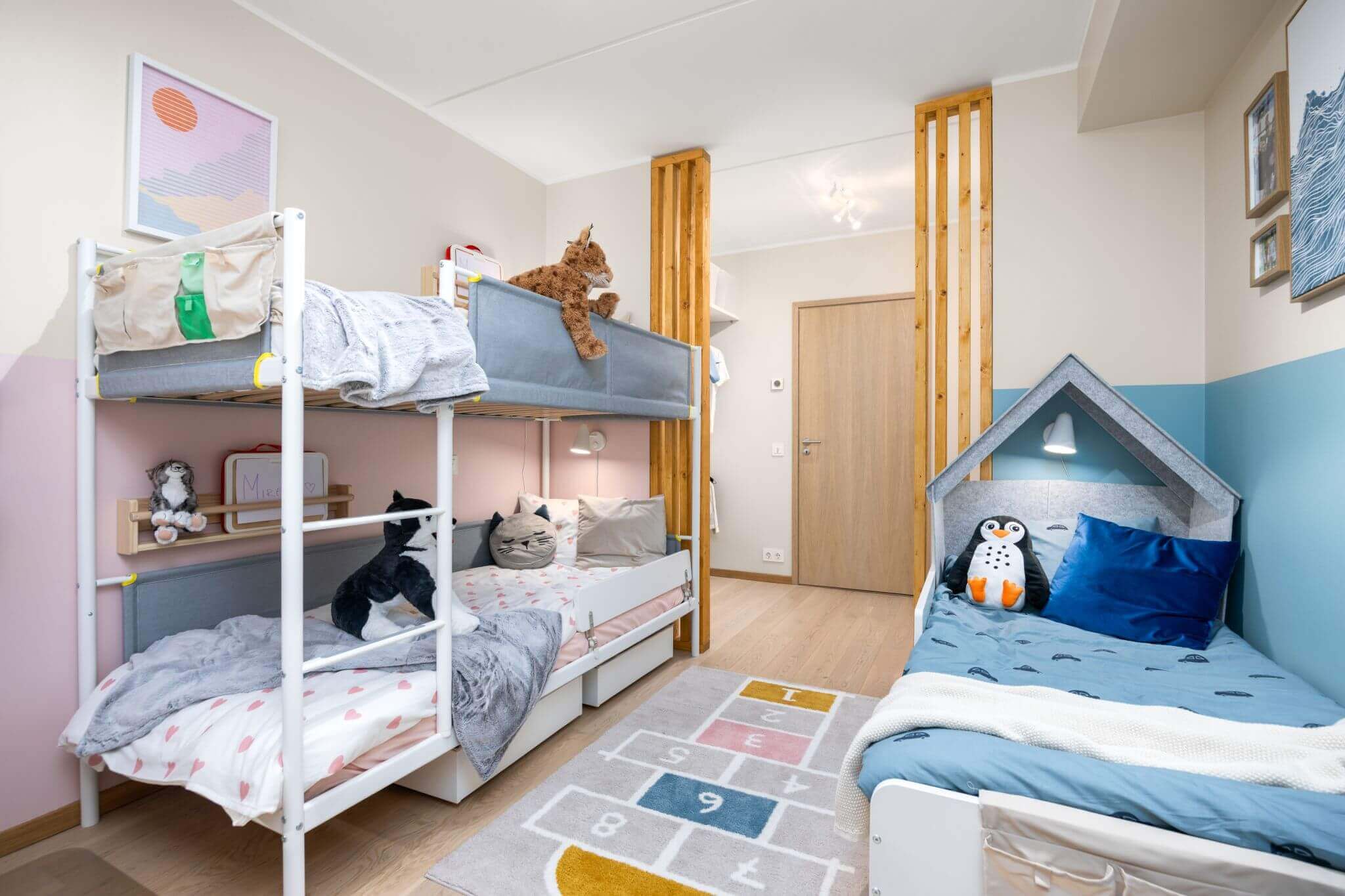 Sisekujundaja valis sellesse tuppa nii lapsevoodi kui narivoodi, et vaba põrandapinda jääks rohkem – tänu sellele mahtus sinna ära ka nooremate laste mängulaud. Lisaks soovitab ta kitsamates oludes kasutada mööblit, mida saab paigutada seinale ja eri kõrgustele, näiteks riiulid ja korrastajad või garderoobilahendused. Alumised kapid on lastele ligipääsetavad ja neid saab kasutada igapäevaste mänguasjade või riiete hoidmiseks, samas kui kõrgemates kappides saab hoida hooajalisi esemeid, mida kogu aeg ei vajata ja mille kättesaamisel tulevad appi vanemad.