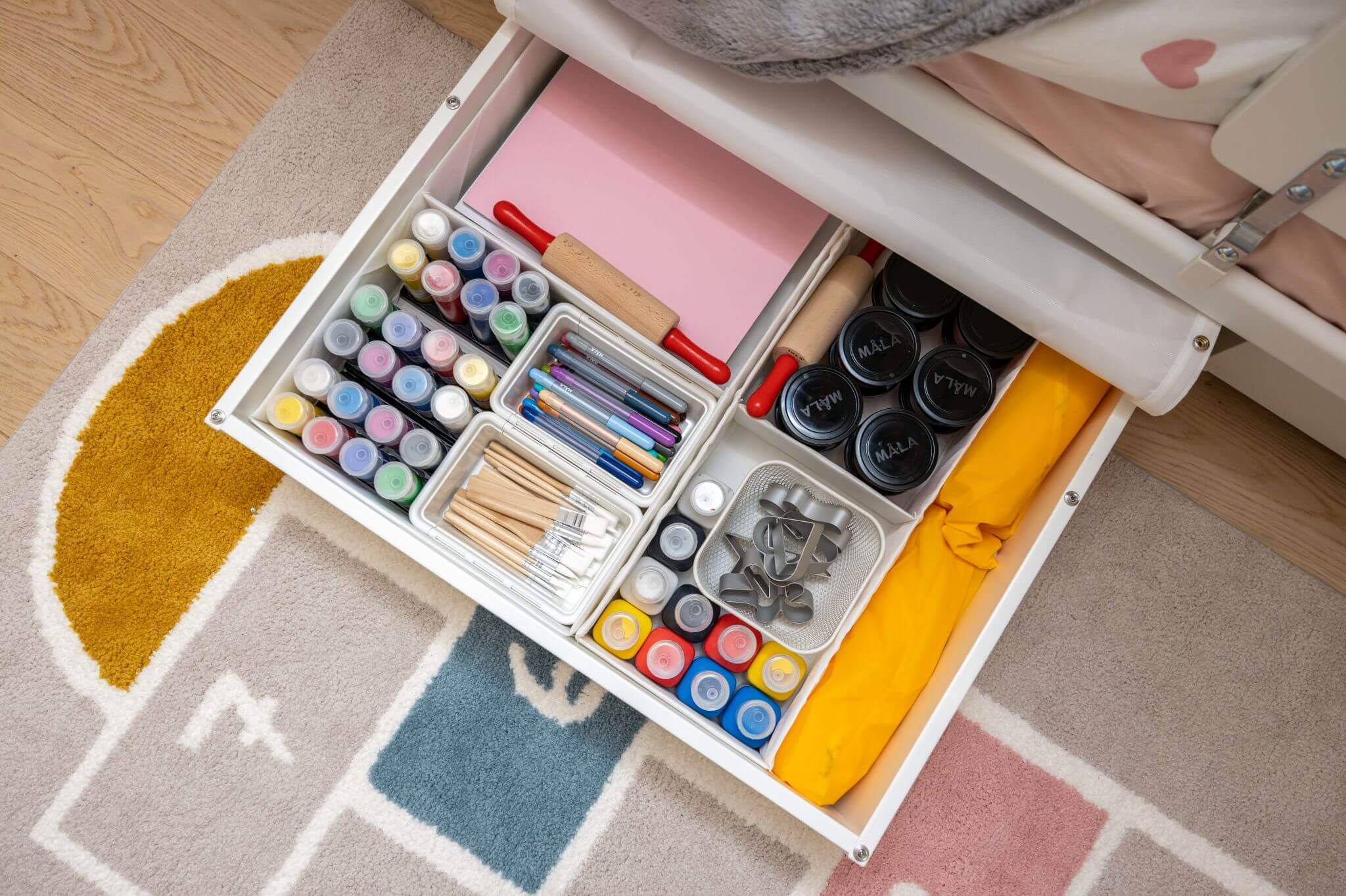 Veel soovitab sisekujundaja võimalikult hästi ära kasutada voodialust ruumi. Sinna võib paigutada näiteks ratastel kastid, mis aitavad mänguasjadele lihtsalt ligi pääseda ja annavad lastele juba varases eas võimaluse ise koristada. Sälli märgib, et kui ruumi napib, tuleks võimalikult palju esemeid hoida kapiuste taga – see aitab tuba korras hoida ja jätab mulje avarusest. Nutikad multifunktsionaalsed mööblilahendused, näiteks voodi, mille all on hoiukastid, pakuvad üheaegselt nii magamis- kui ka hoiuruumi ega hõiva põrandapinda.
