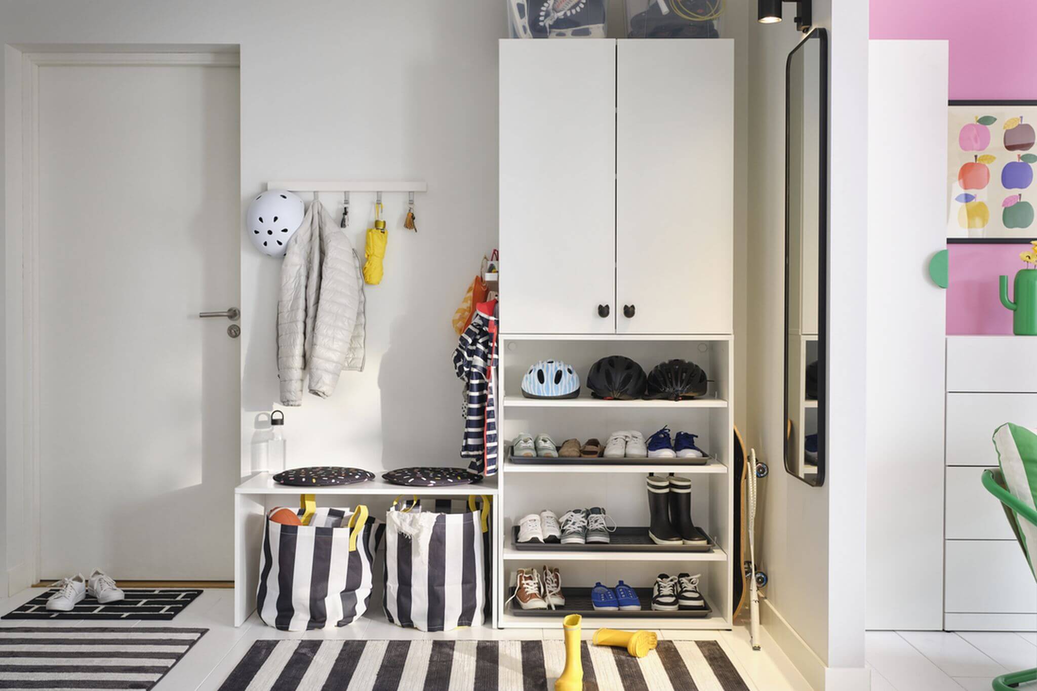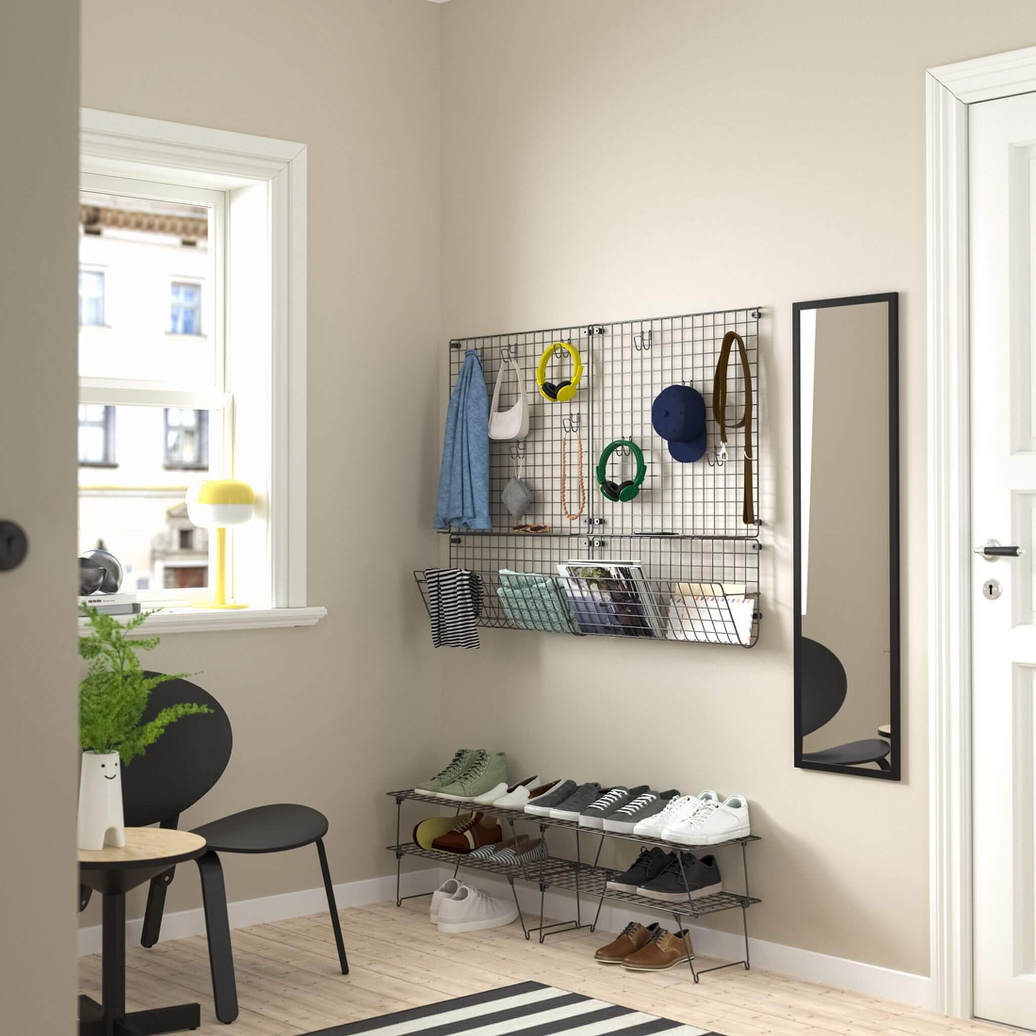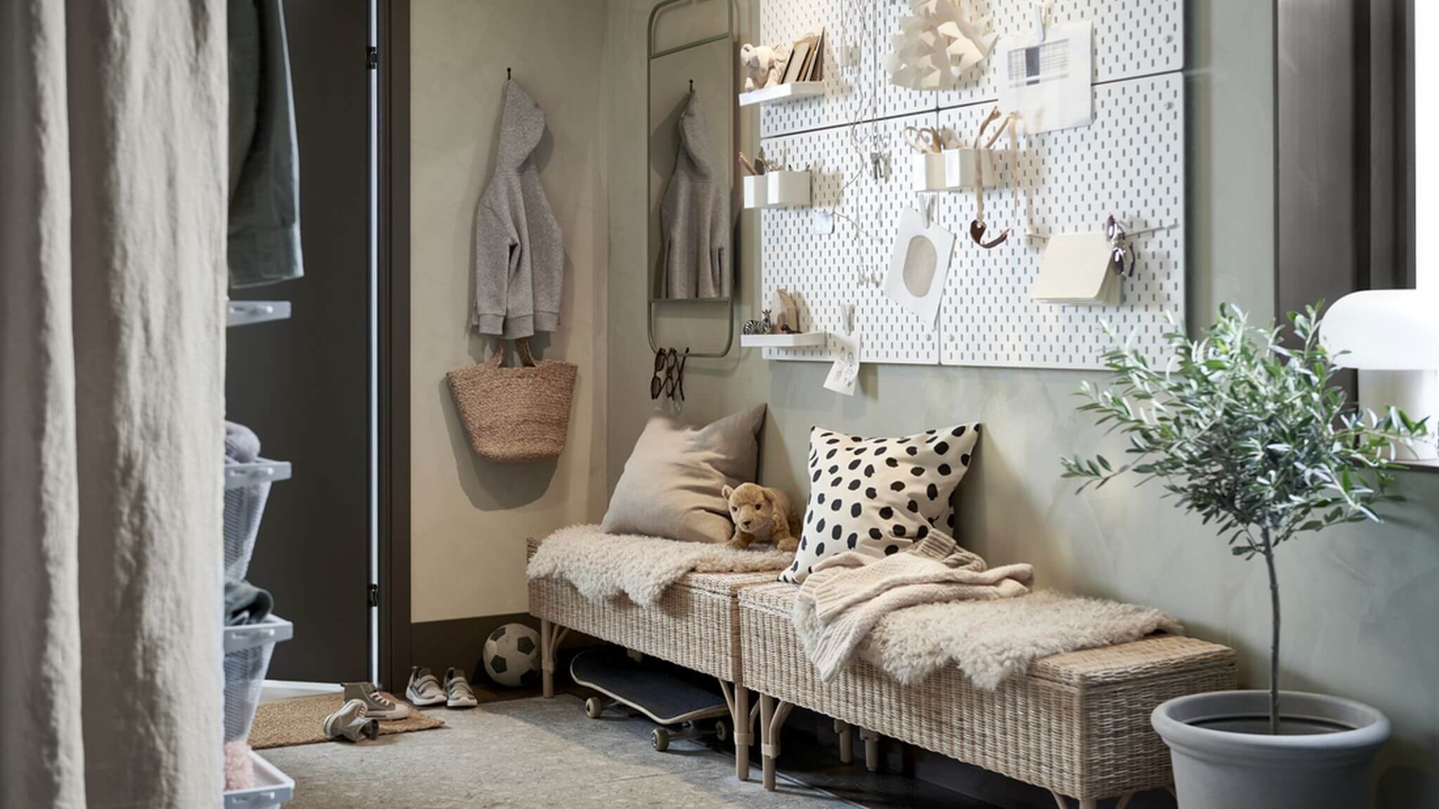 „Kui paigaldad nagid eri kõrgustele, saad väga funktsionaalse lahenduse mitte ainult mantlite ja jakkide, vaid ka käekottide, seljakottide ja vihmavarjude jaoks. Lisades jalatsikapi kohale perfotahvli, kuhu saab hõlpsalt kinnitada konksud, klambrid või väikesed korvid, tekib käepärane hoiulahendus, kus võtmetel, päikeseprillidel ja laadijatel on oma kindel koht,“ ütles sisekujundaja.